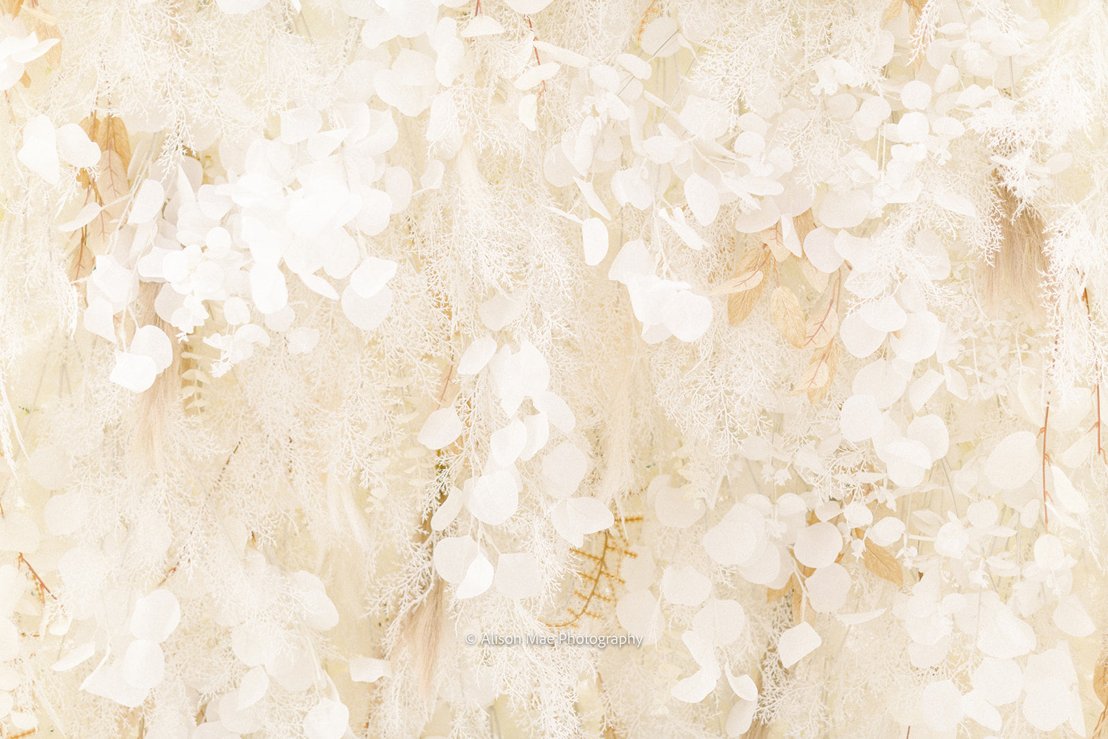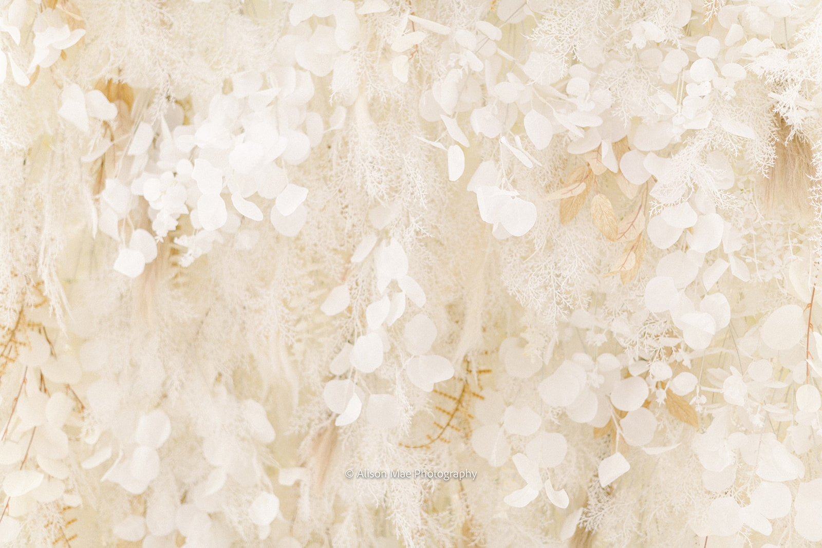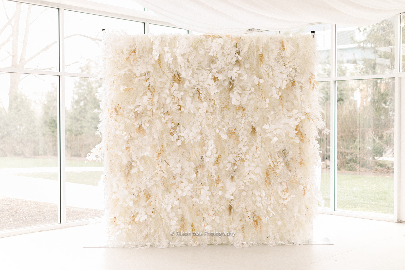 The Aveline Flower Wall is the absolutely stunning in person and photos! It is made from 4 different varieties of high quality artificial pampas, white dyed eucalyptus, white roses, and dried leaves.