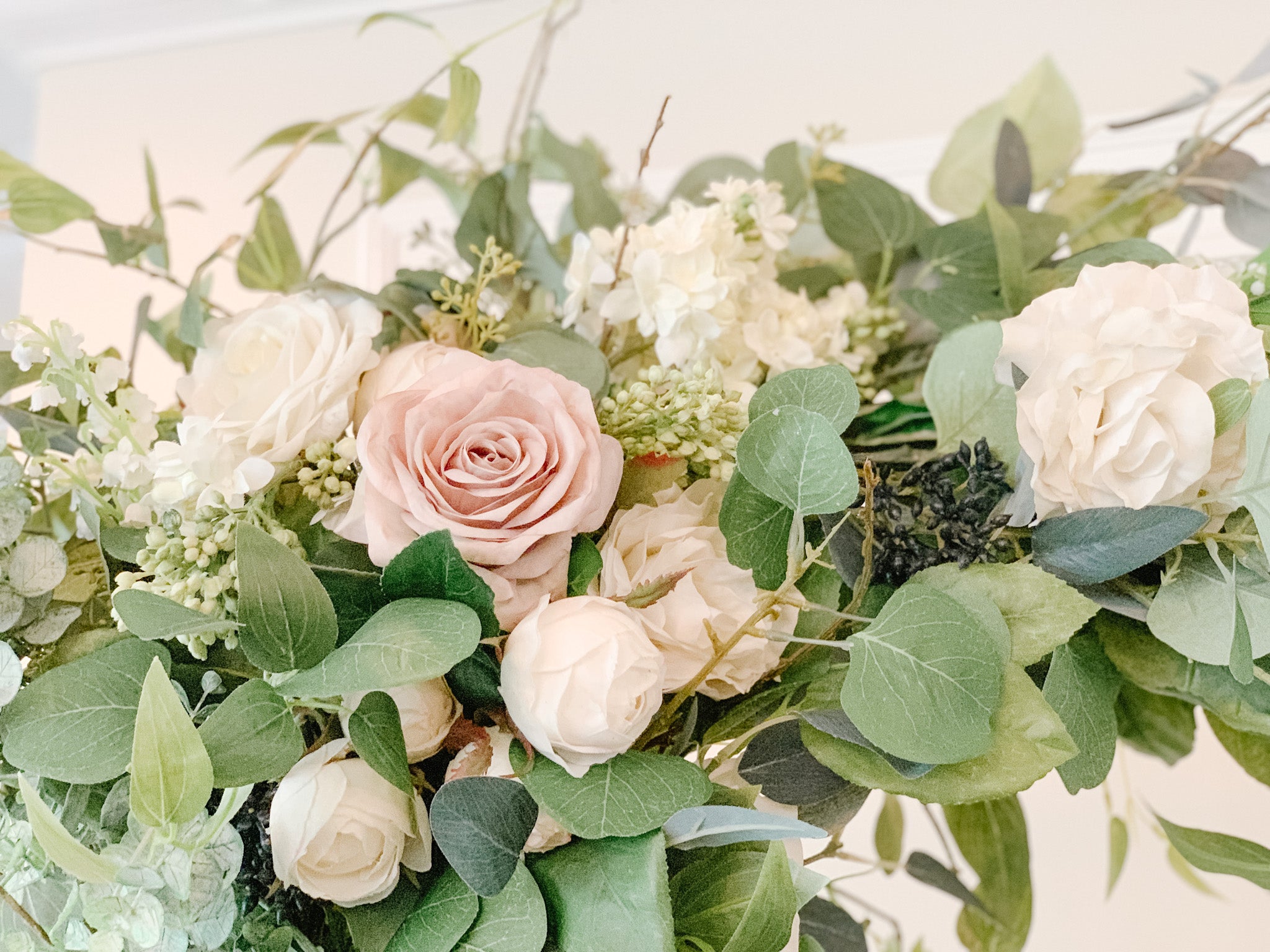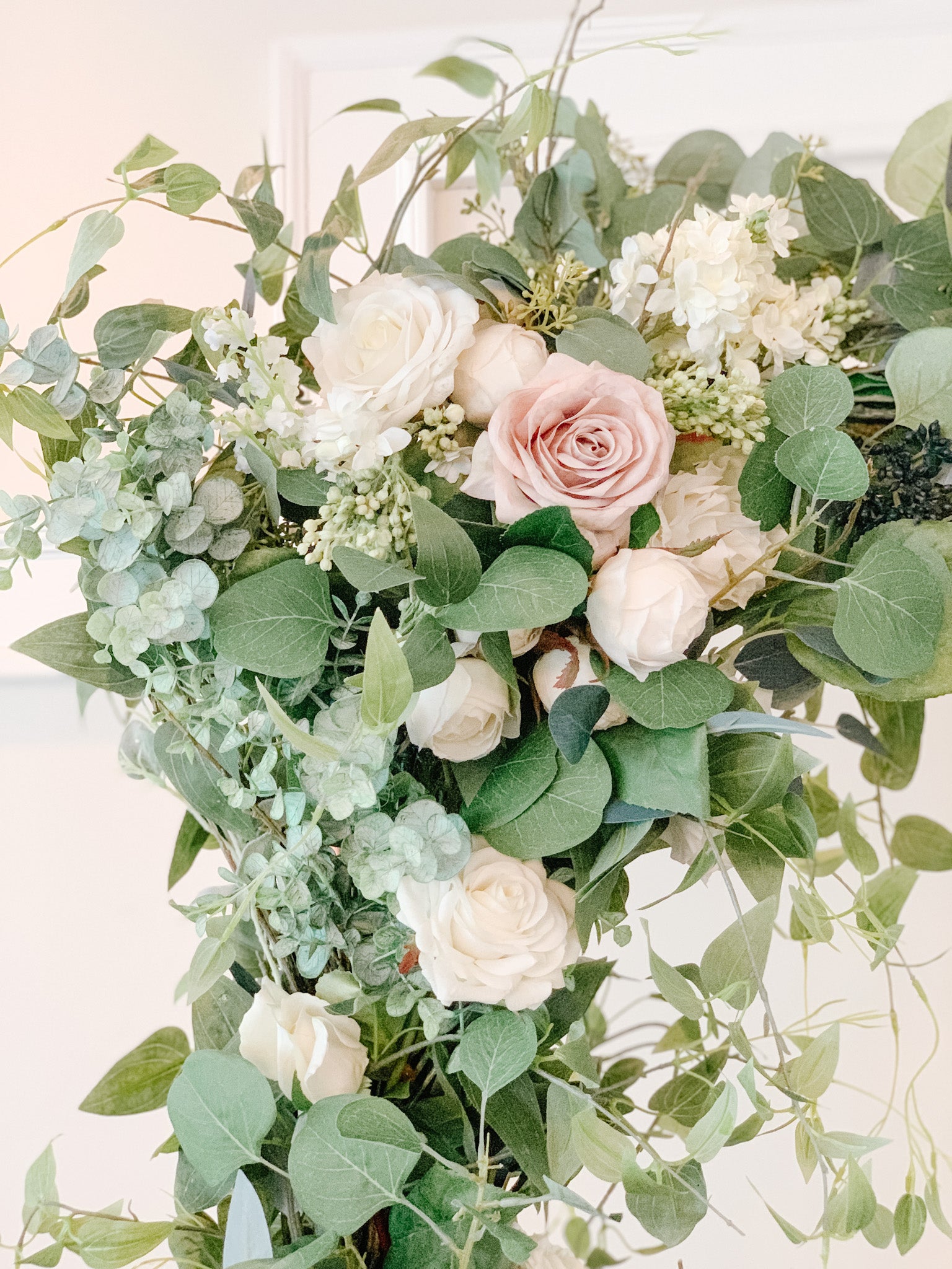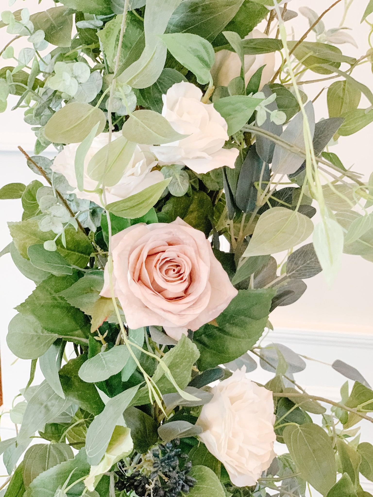 For this arch we used silver dollar eucalyptus, true blue eucalyptus, seeded eucalyptus, tree branches, clematis, dusty miller, and berry leaves. We also added in real touch ivory roses and buds. This arch can be customized with other flowers, artificial or fresh flowers for an additional cost. Please email us for an estimate based off of the desired customization.