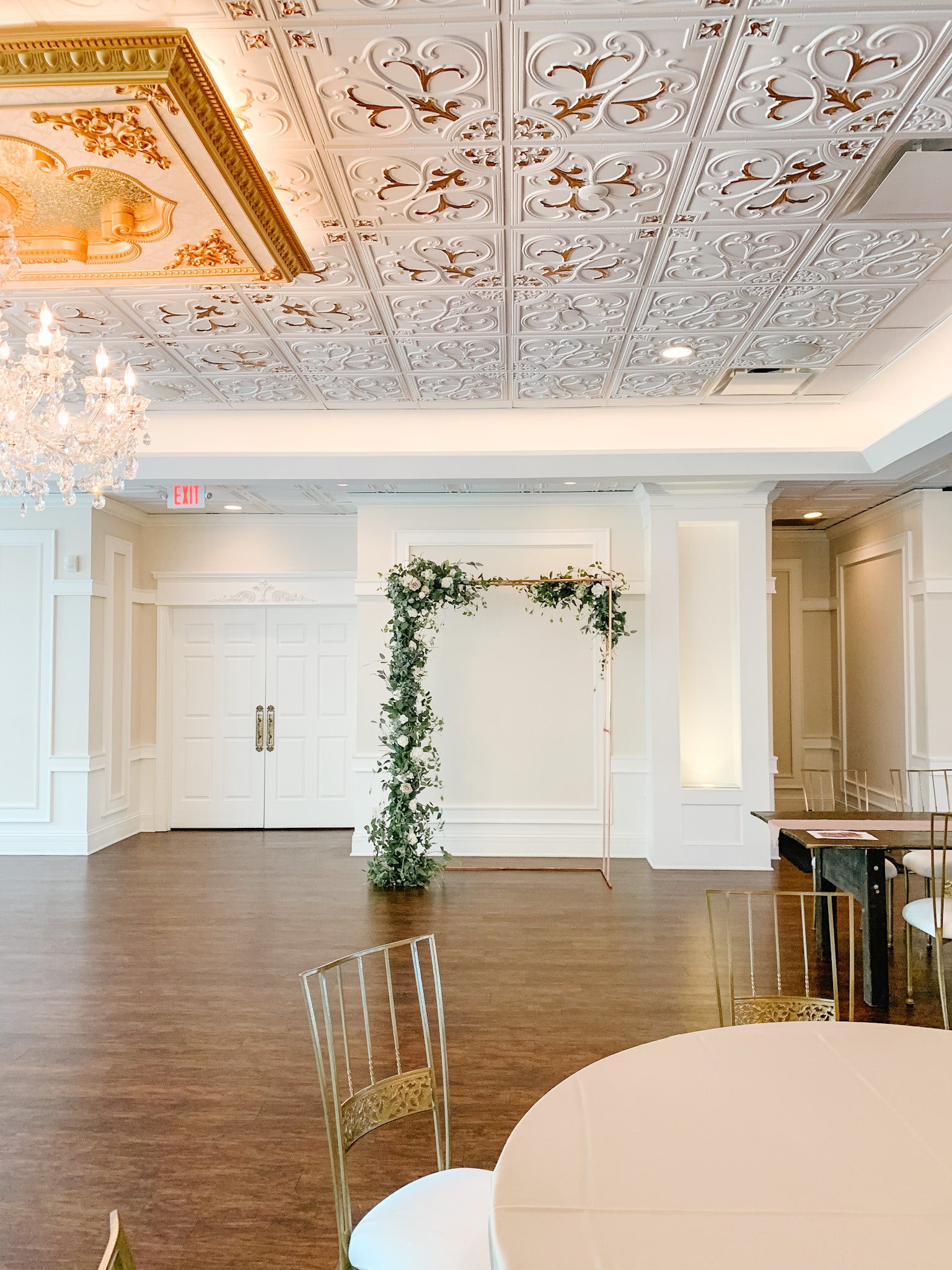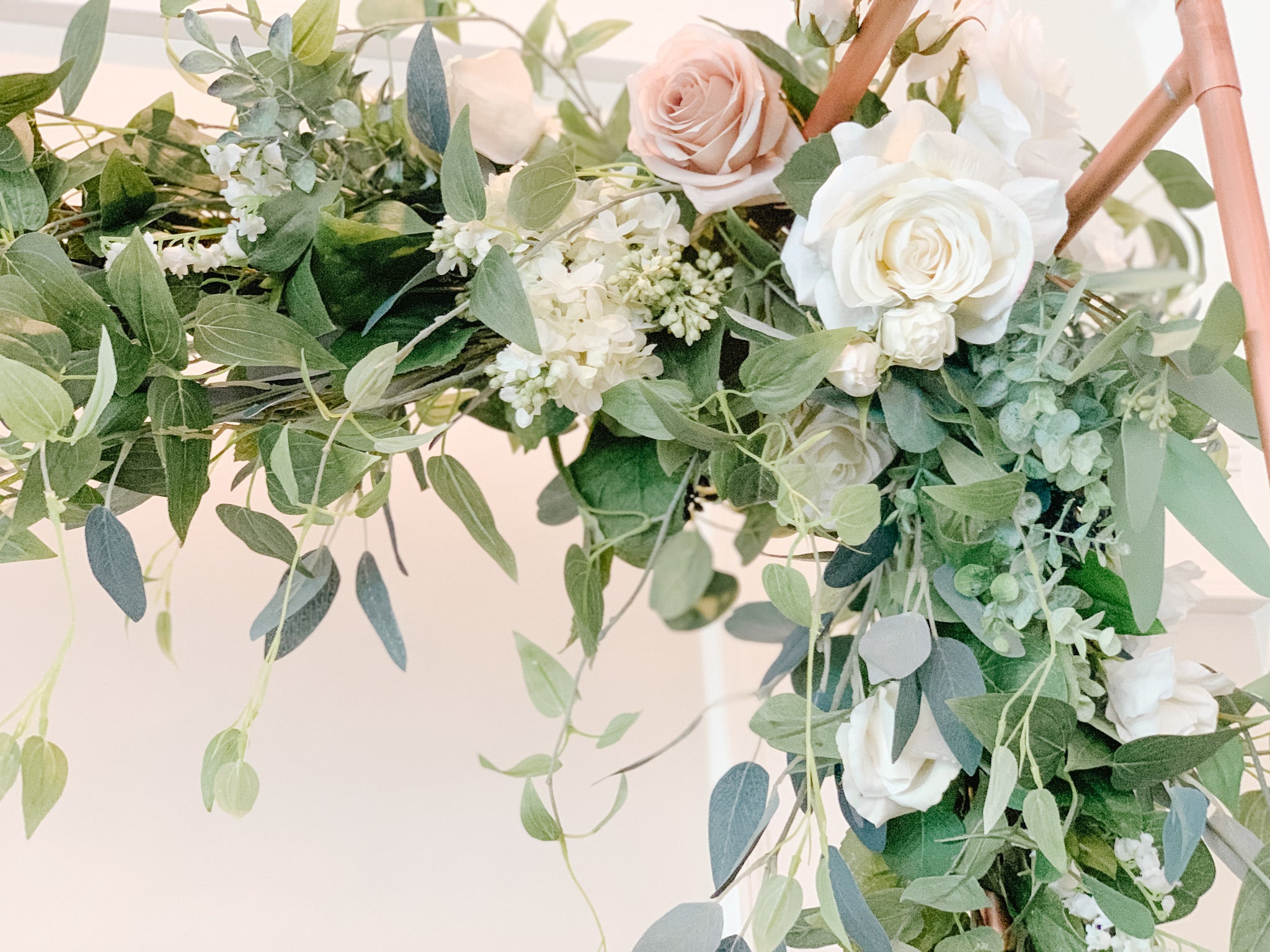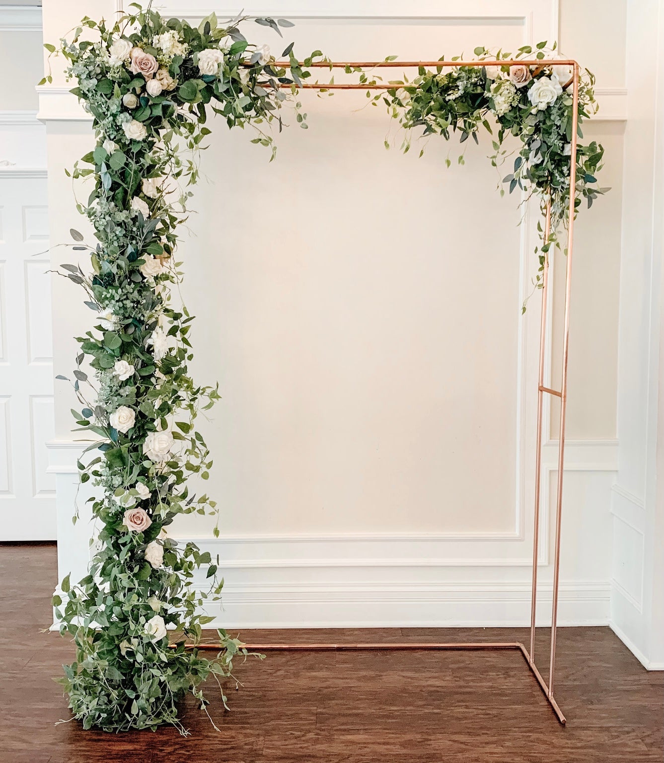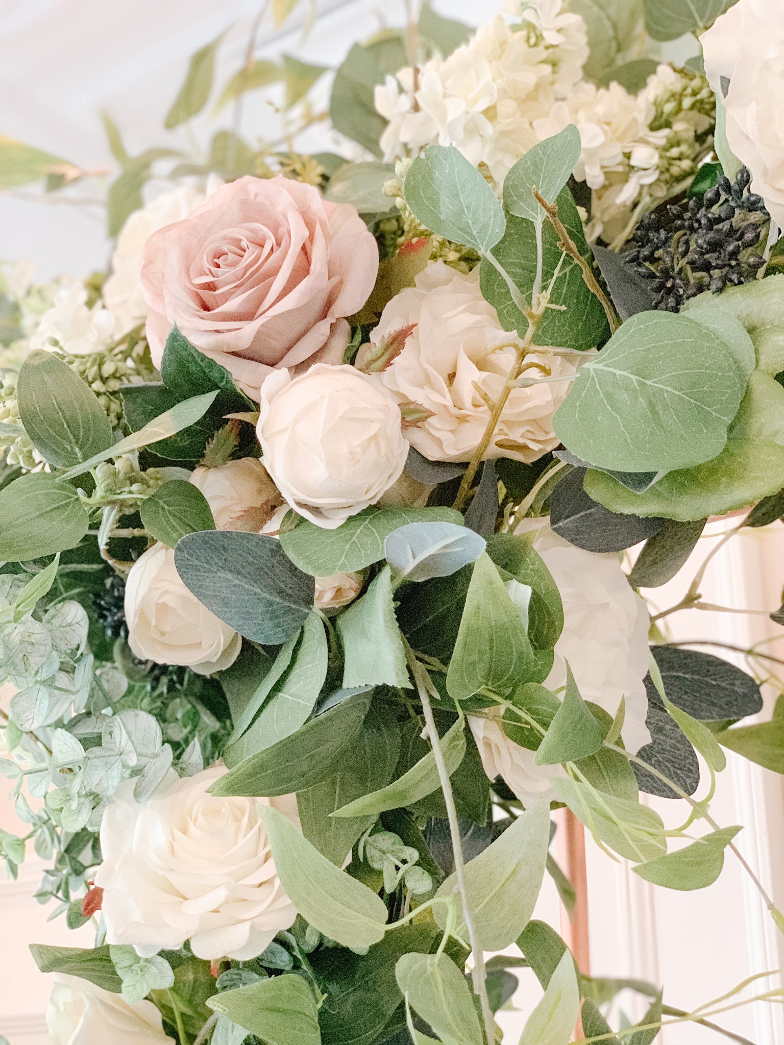 For this arch we used silver dollar eucalyptus, true blue eucalyptus, seeded eucalyptus, tree branches, clematis, dusty miller, and berry leaves. We also added in real touch ivory roses and buds. This arch can be customized with other flowers, artificial or fresh flowers for an additional cost. Please email us for an estimate based off of the desired customization.