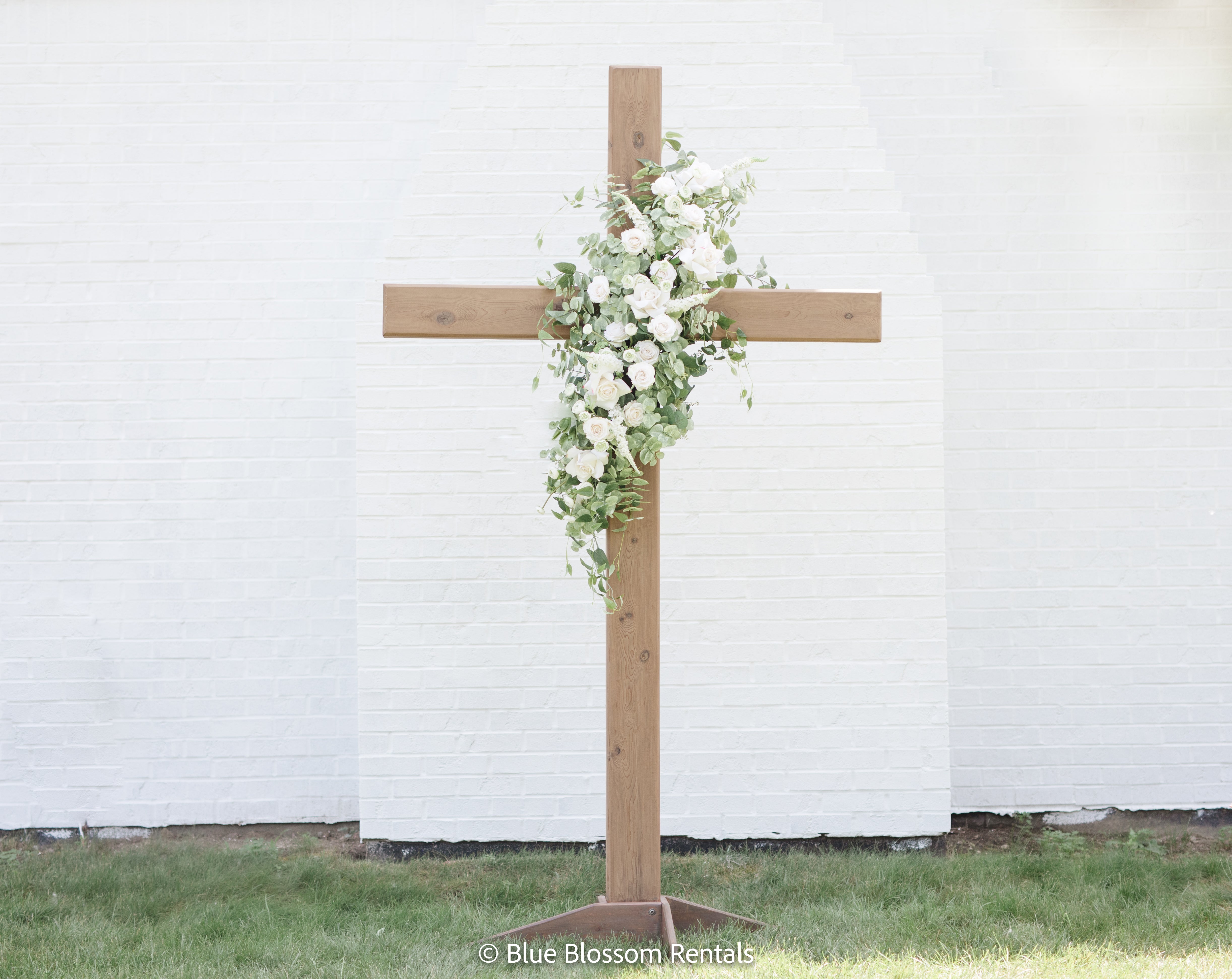 This beautiful, hand-made, cedar cross is the perfect addition for any outdoor or indoor wedding. We added beautiful white playa blanca roses, white ranunculus, ivory spray roses, ivory veronica, and sage eucalyptus, with touches of clematis draping down the sides.