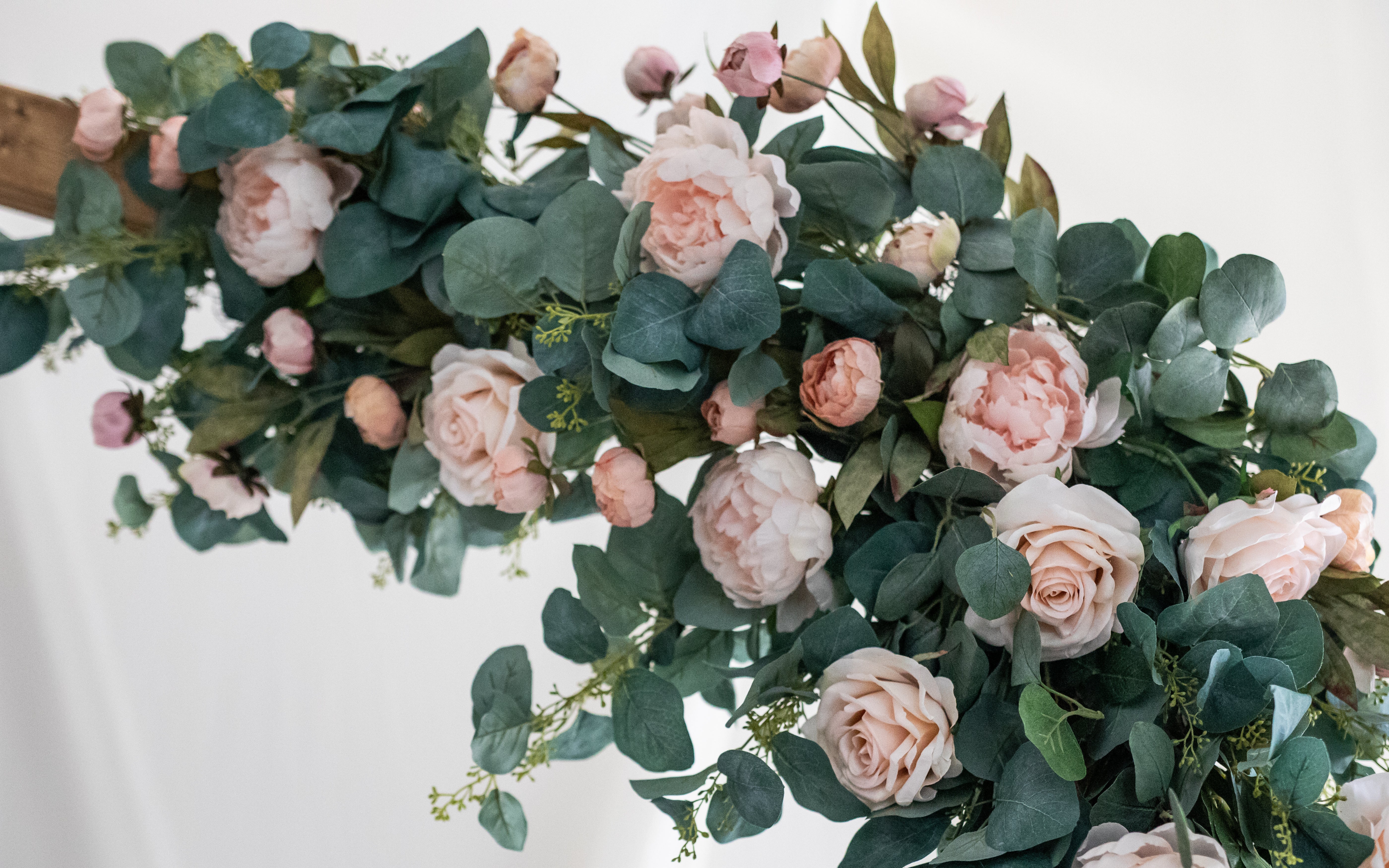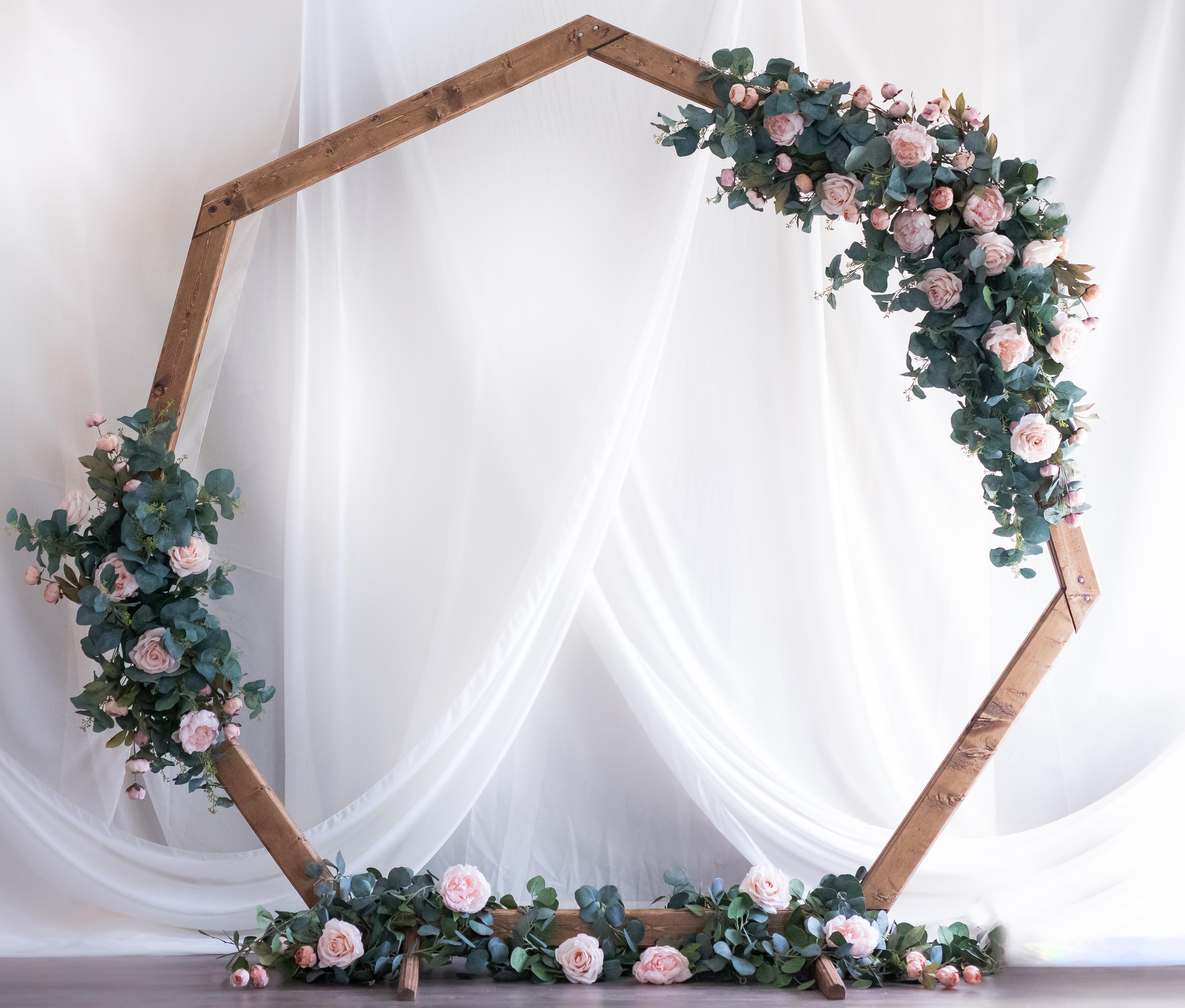 This heptagon arch is flawless! From the custom details in the wood, to the perfect angles, it's sure to make a beautiful statement at any wedding or event. The florals shown come complementary with the rental, if desired, and can be chosen in white or blush!