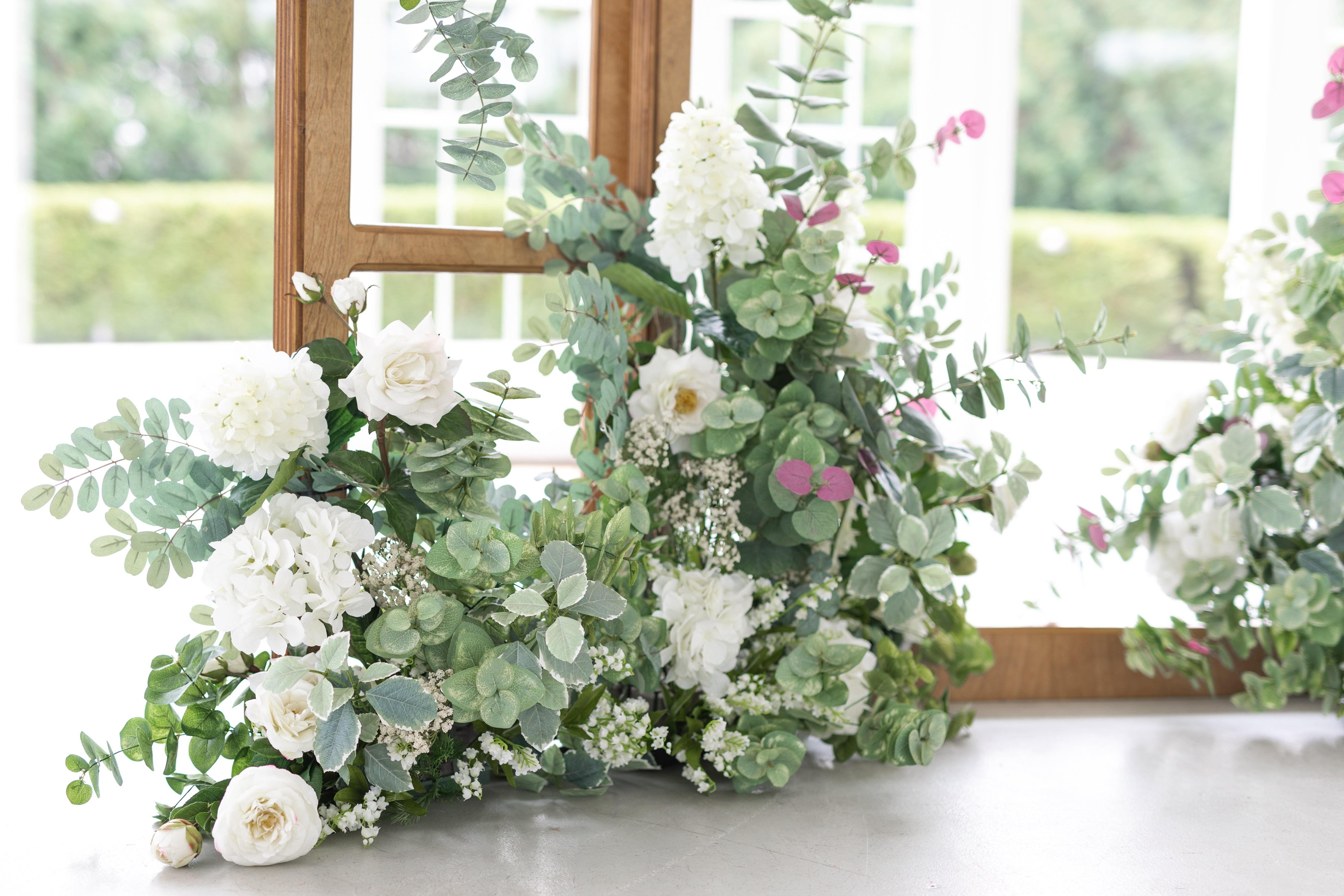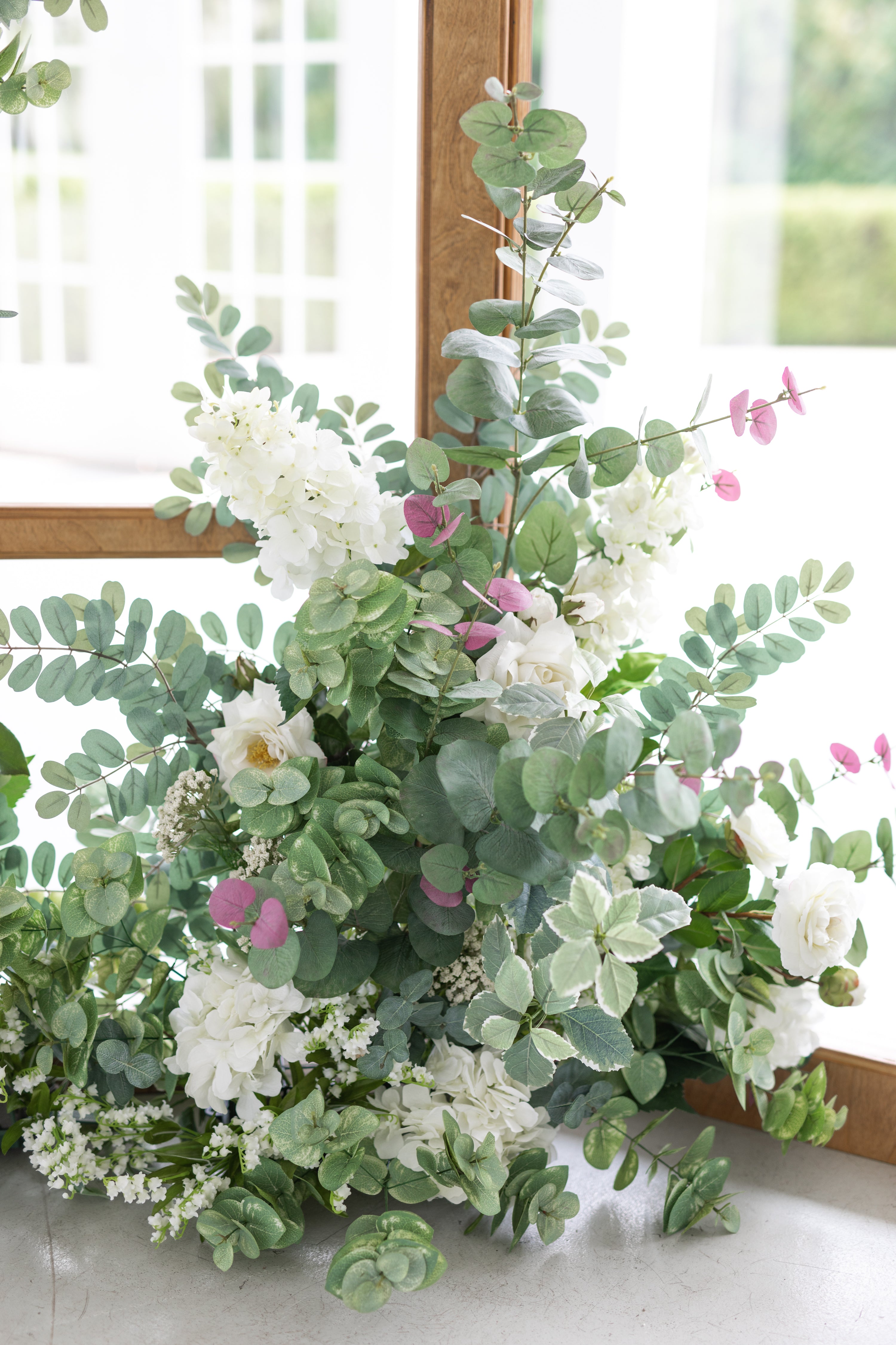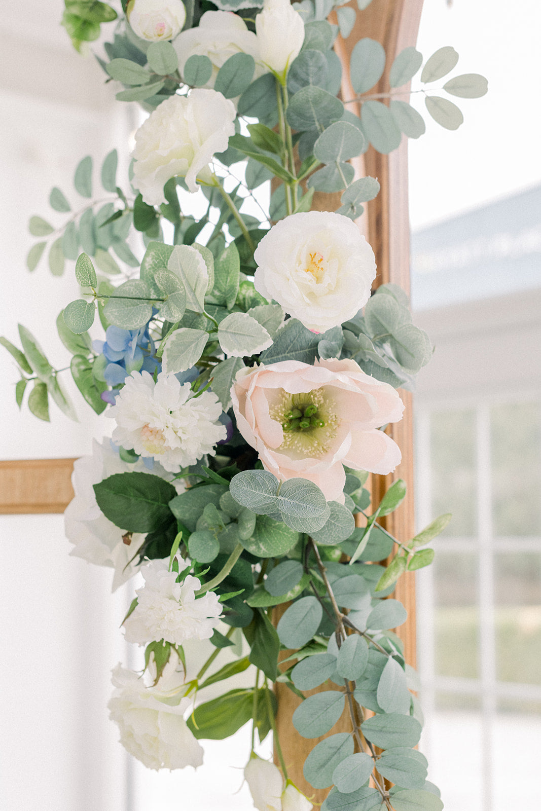 We created a soft and airy garden style flower design for this arch with ivory garden roses, ivory rose spray, white hydrangeas, white lisianthus, ivory scabiosa, and ivory gypsophila, with various types of eucalyptus and greens.