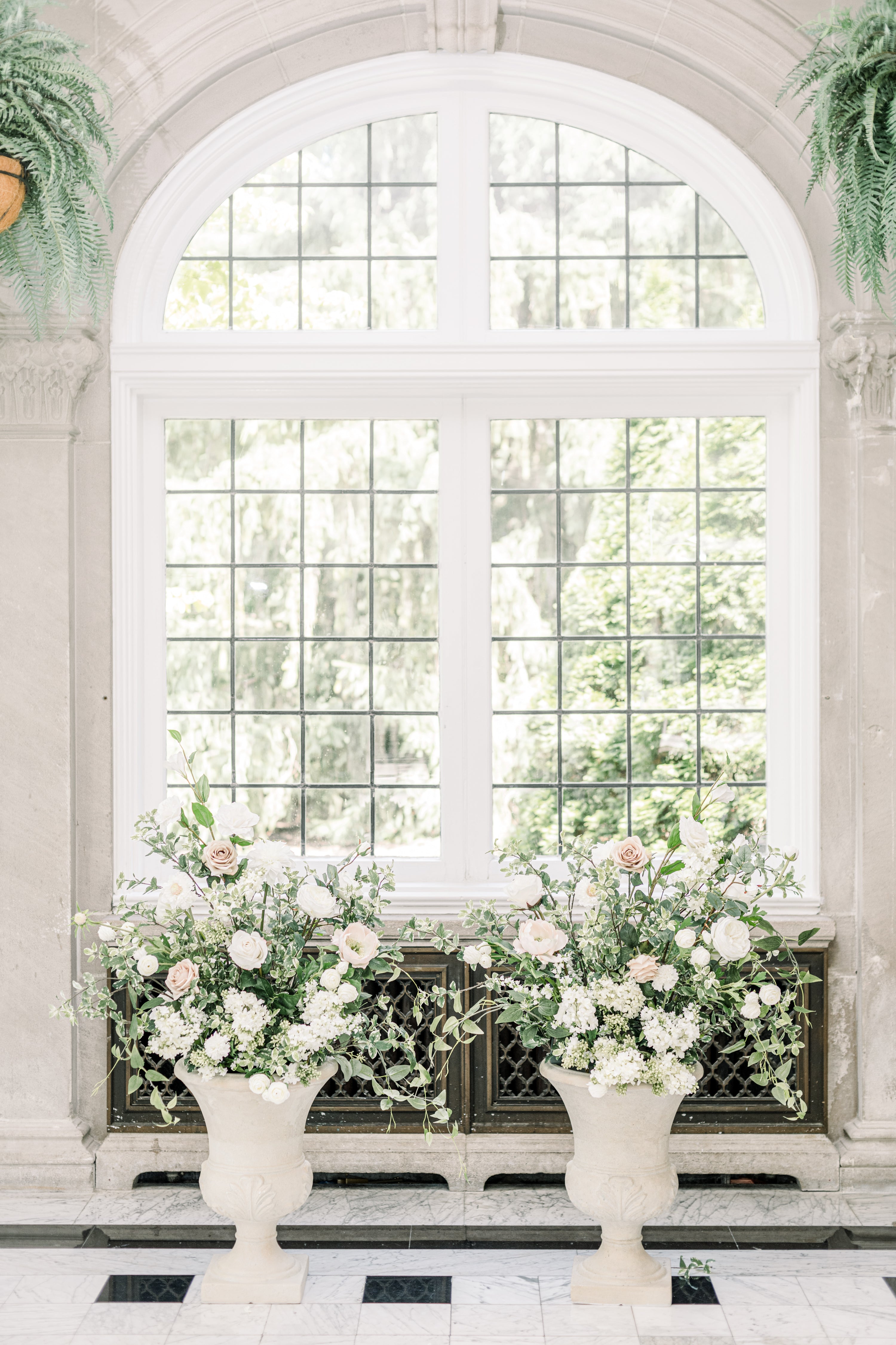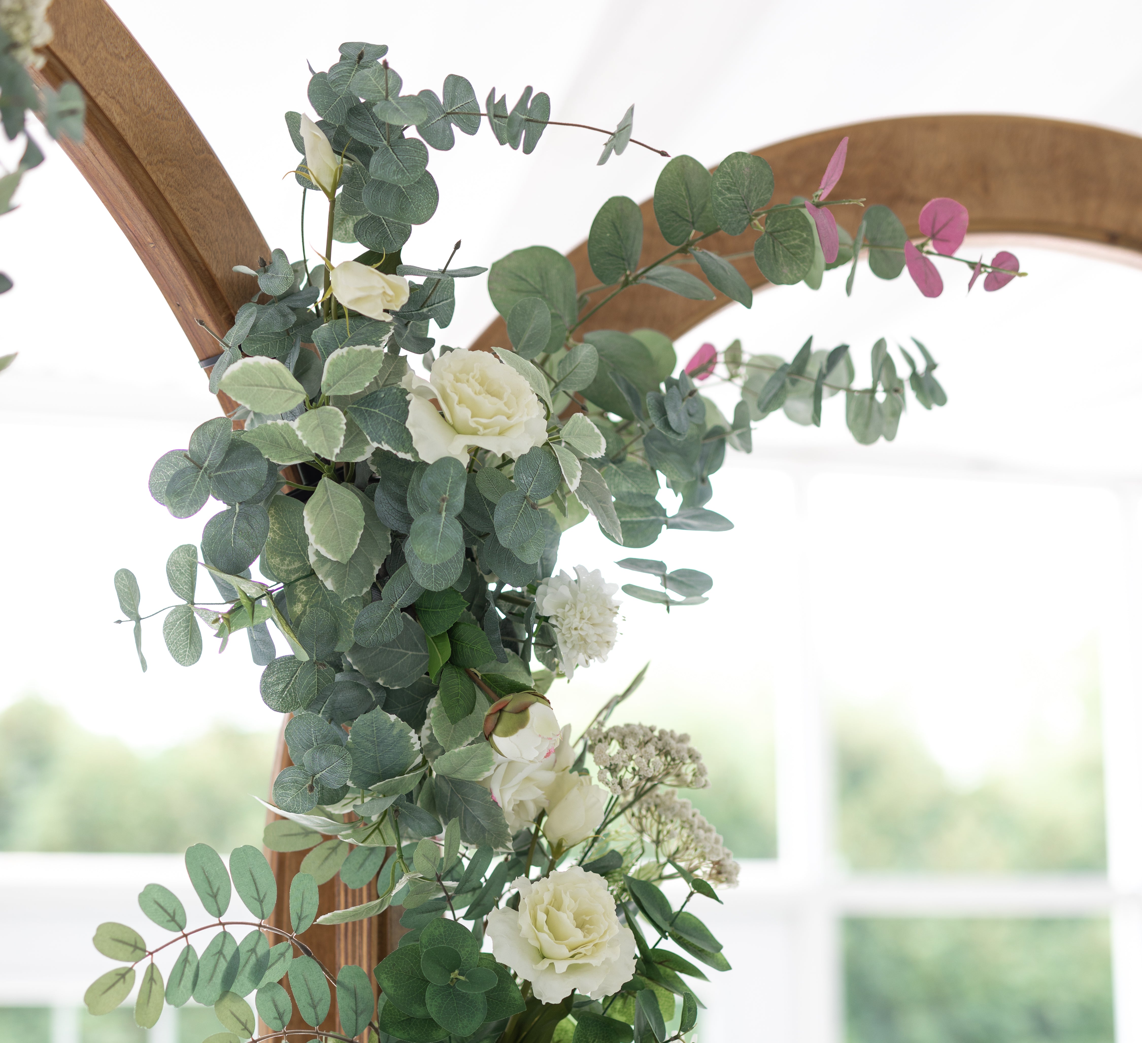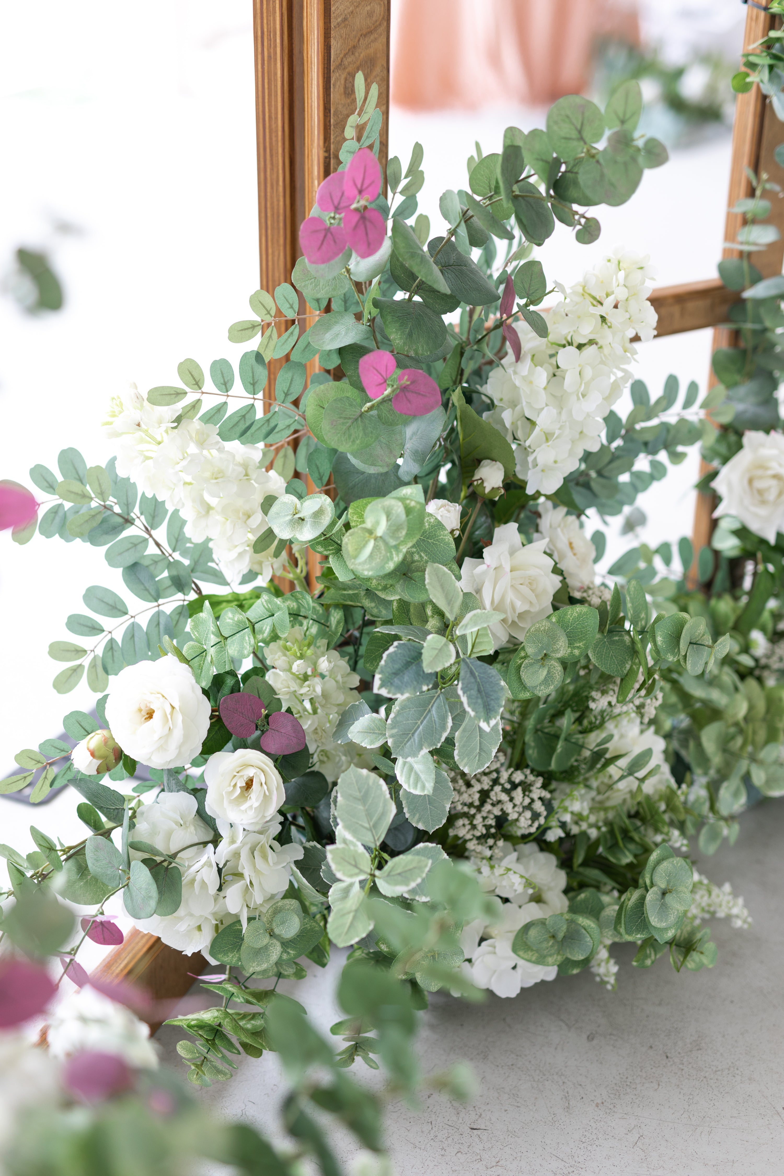 We created a soft and airy garden style flower design for this arch with ivory garden roses, ivory rose spray, white hydrangeas, white lisianthus, ivory scabiosa, and ivory gypsophila, with various types of eucalyptus and greens.