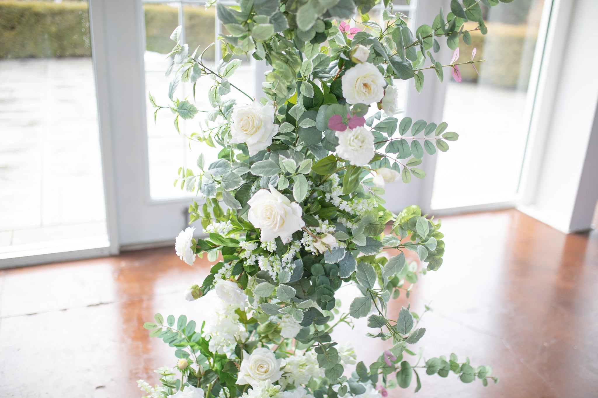 This arch comes standard with ivory, and white flowers, plus lush greenery as shown in the photos.