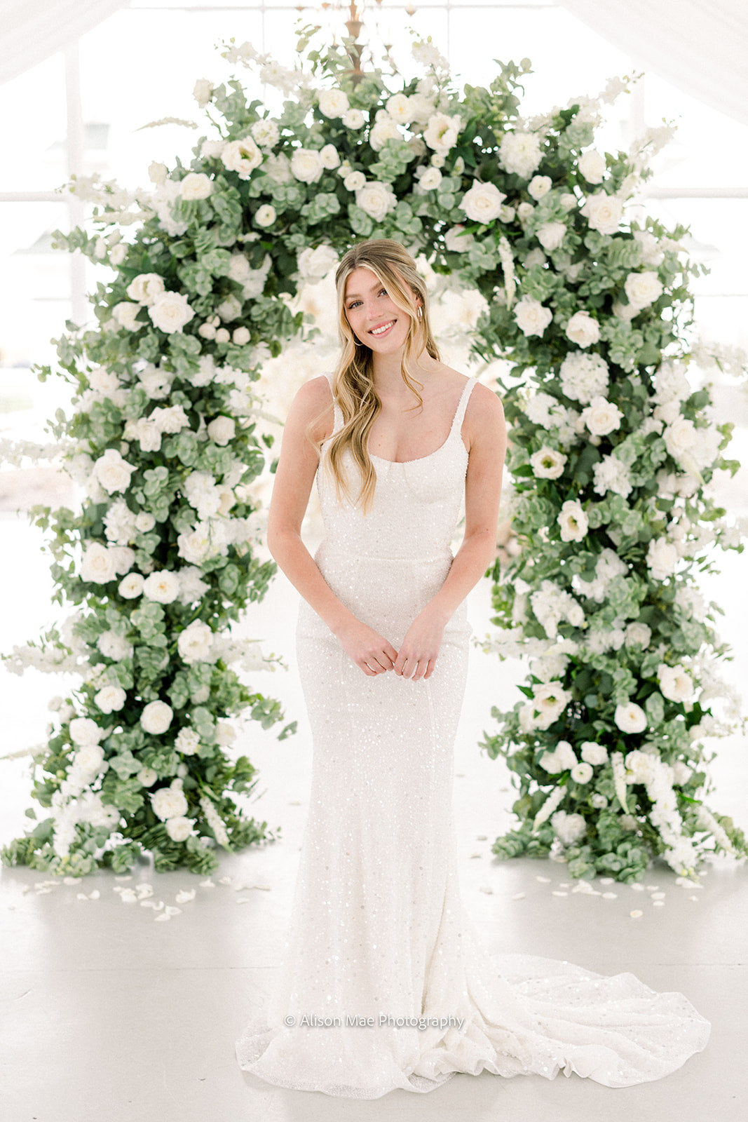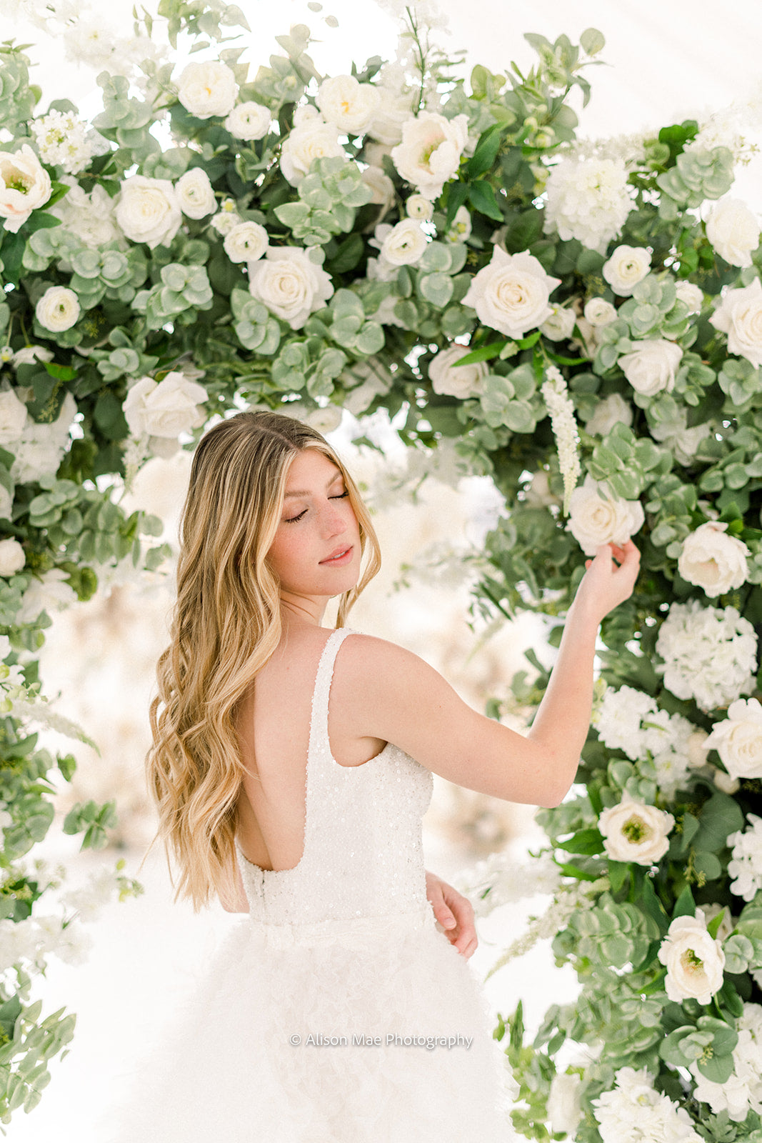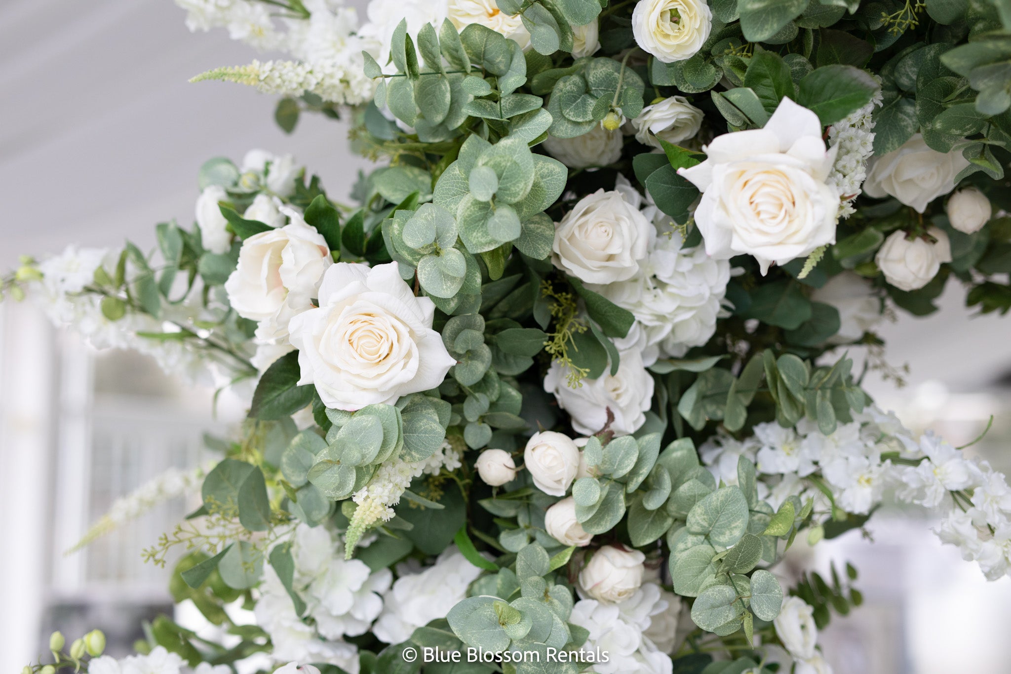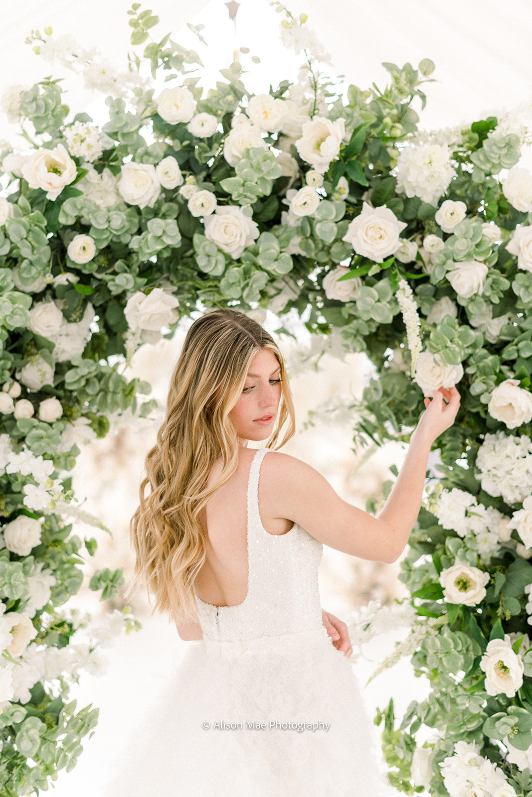The Emma Arch was created with a soft and airy garden style flower design using hydrangeas, white garden roses, white playa blanca roses, white delphinium, ivory veronica, white ranunculus, ivory peonies, white lilac, ivory rose buds, with seeded eucalyptus, and sage spiral eucalyptus. The shape of the arch is the newest trend for weddings, although it is a very classic style that will always be in.