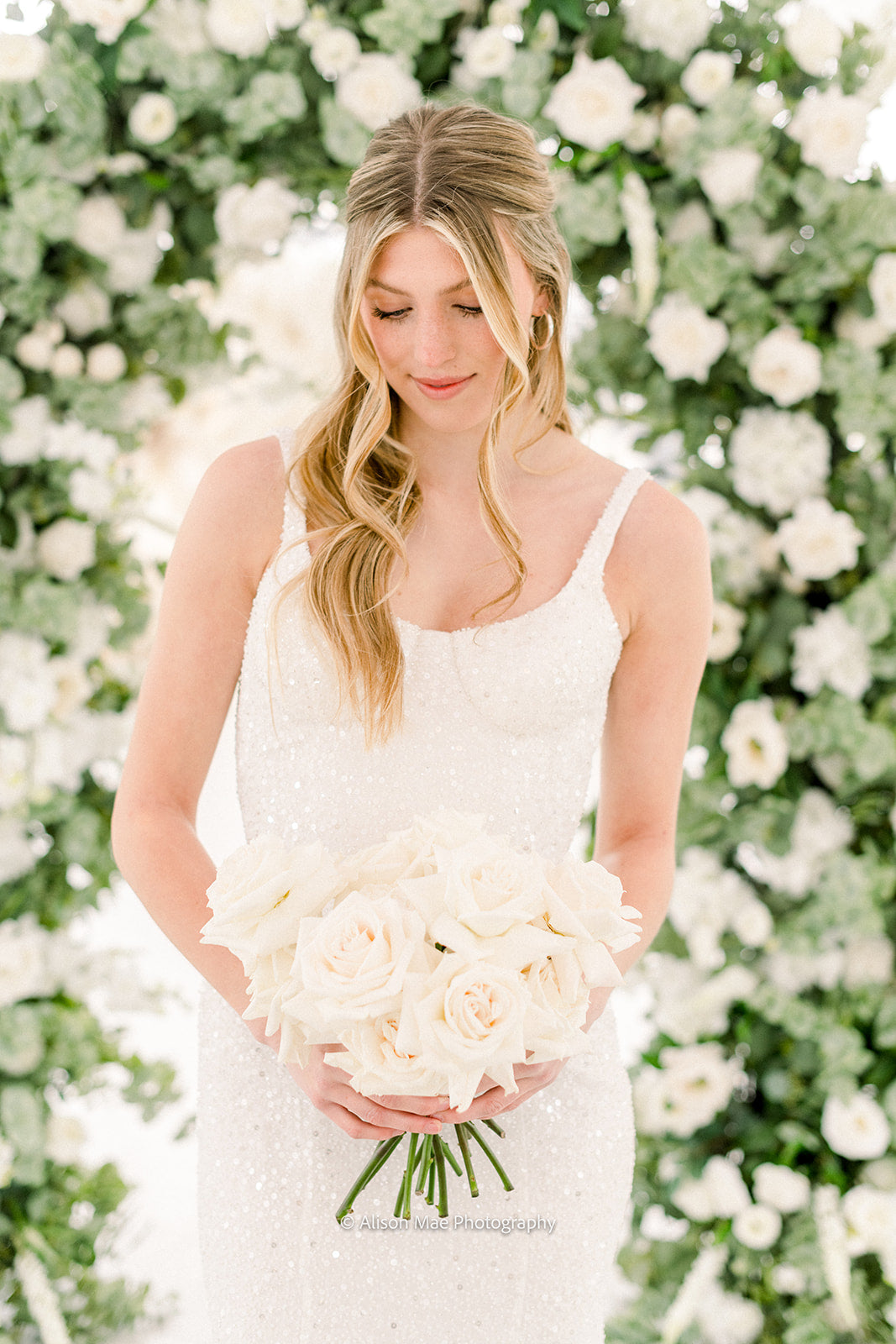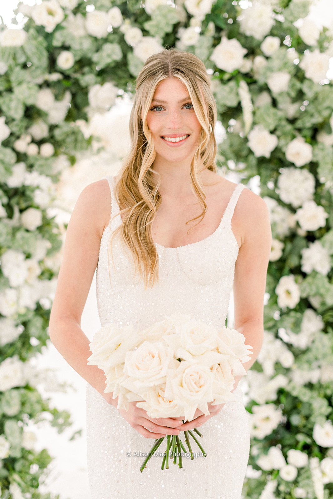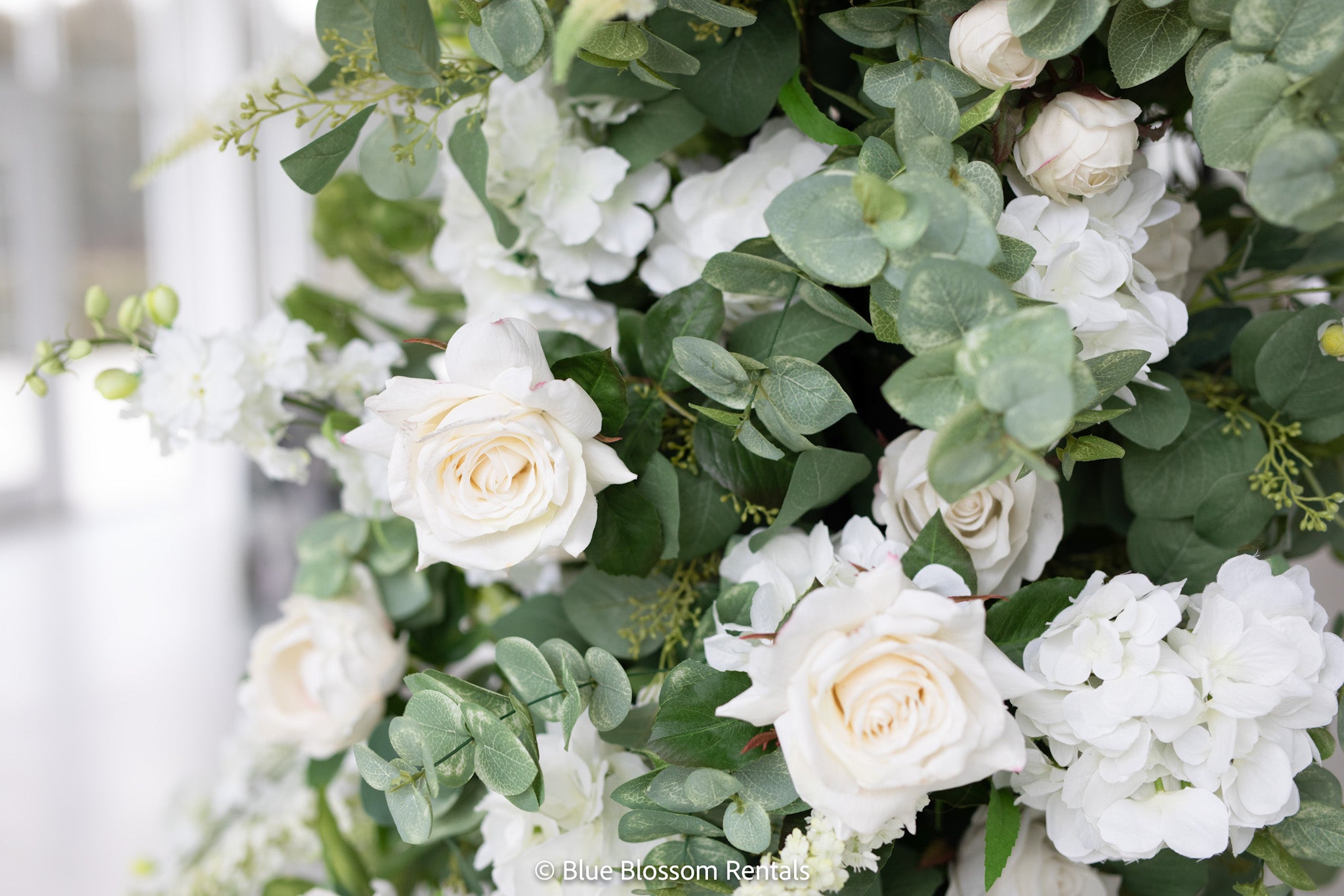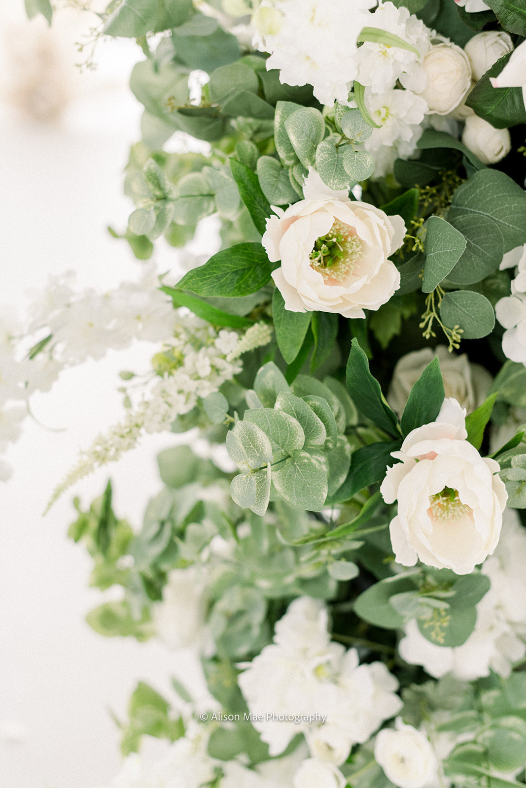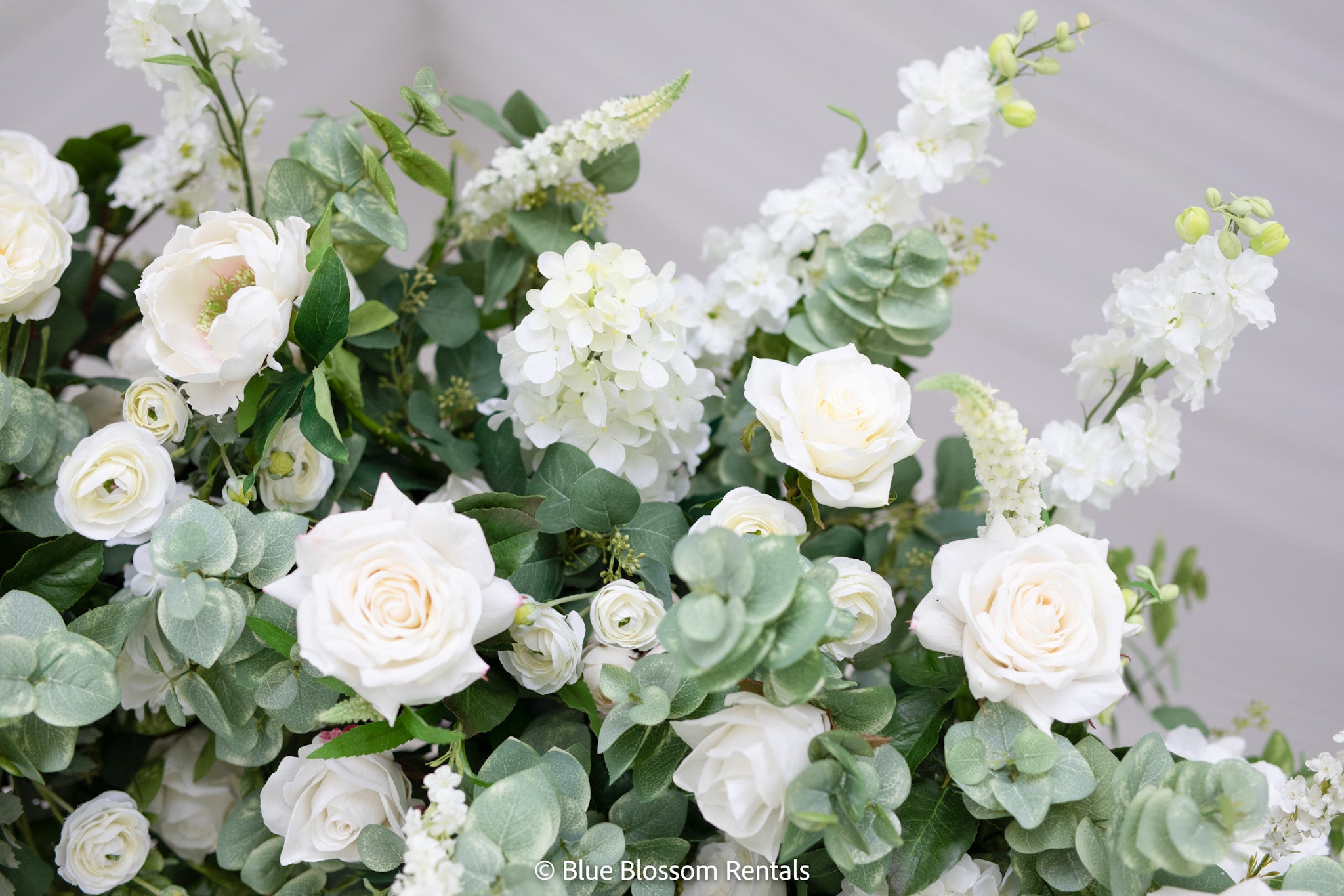 The Emma Arch was created with a soft and airy garden style flower design using hydrangeas, white garden roses, white playa blanca roses, white delphinium, ivory veronica, white ranunculus, ivory peonies, white lilac, ivory rose buds, with seeded eucalyptus, and sage spiral eucalyptus. The shape of the arch is the newest trend for weddings, although it is a very classic style that will always be in.