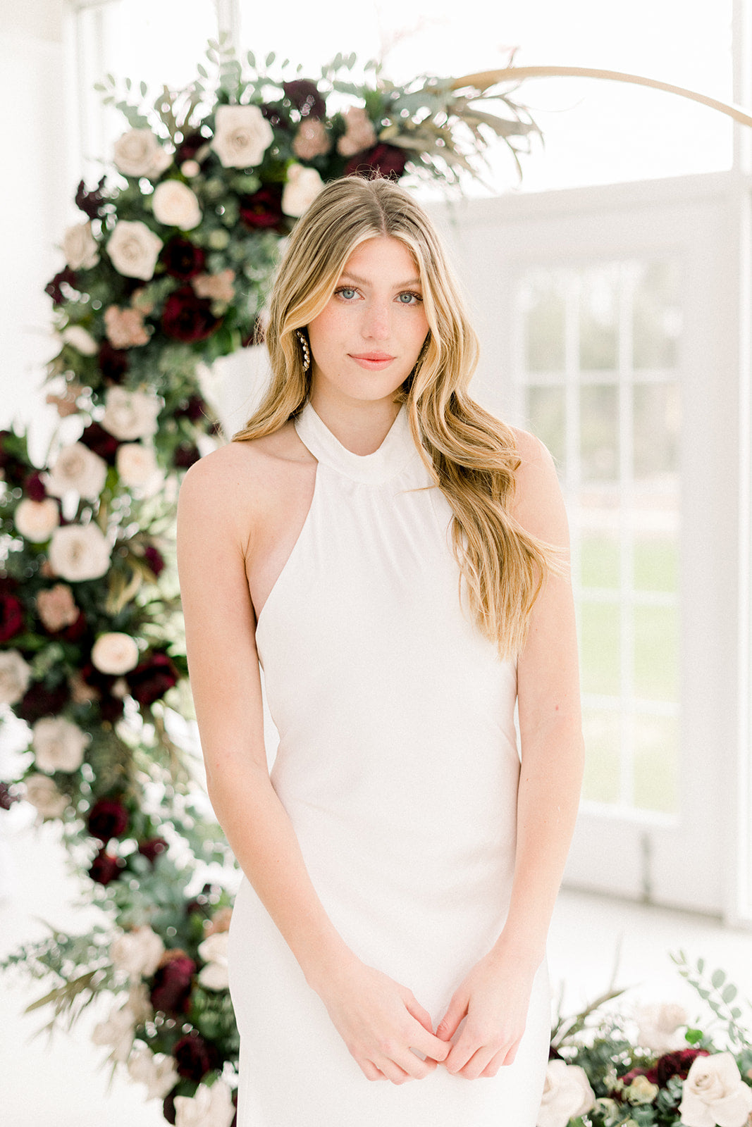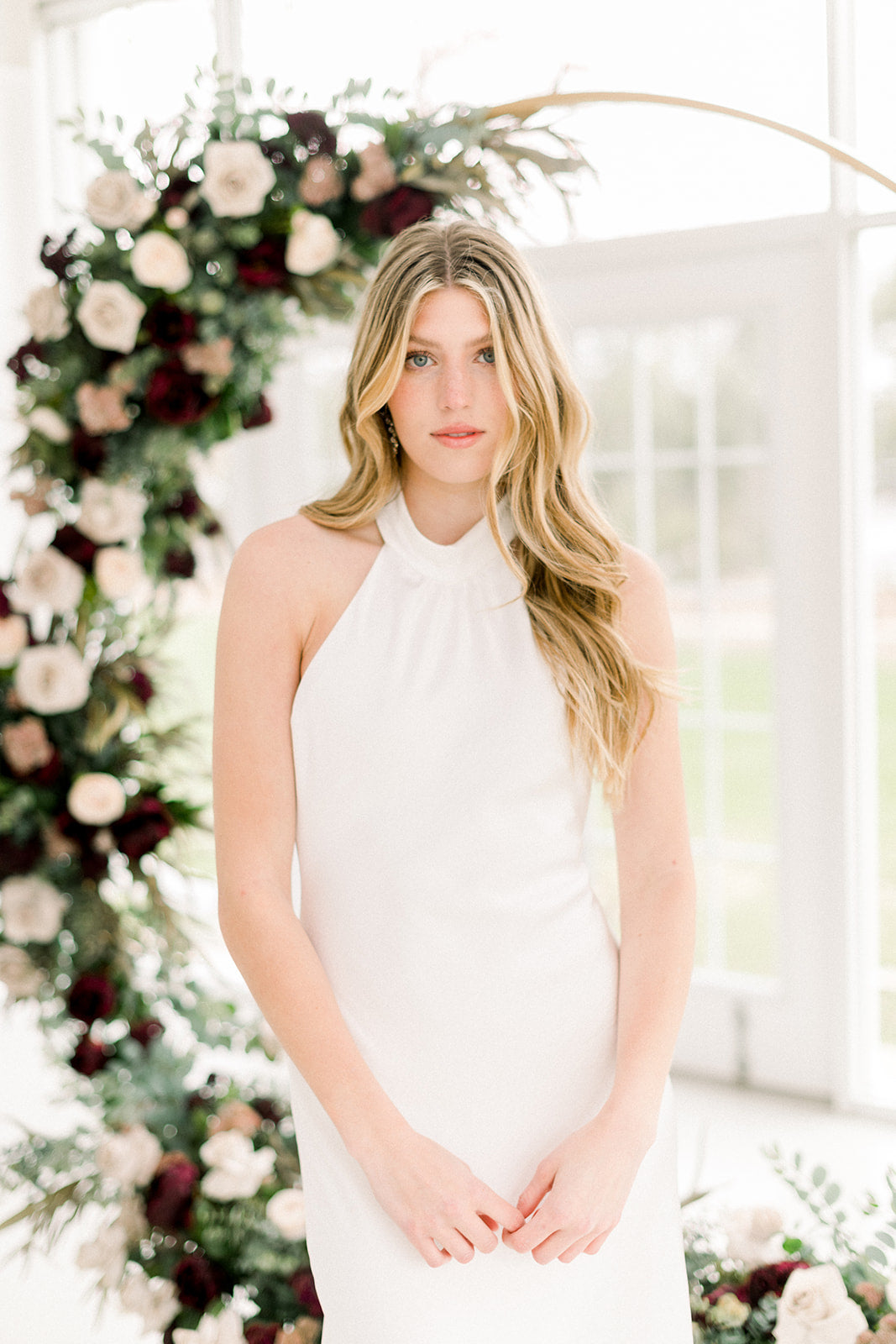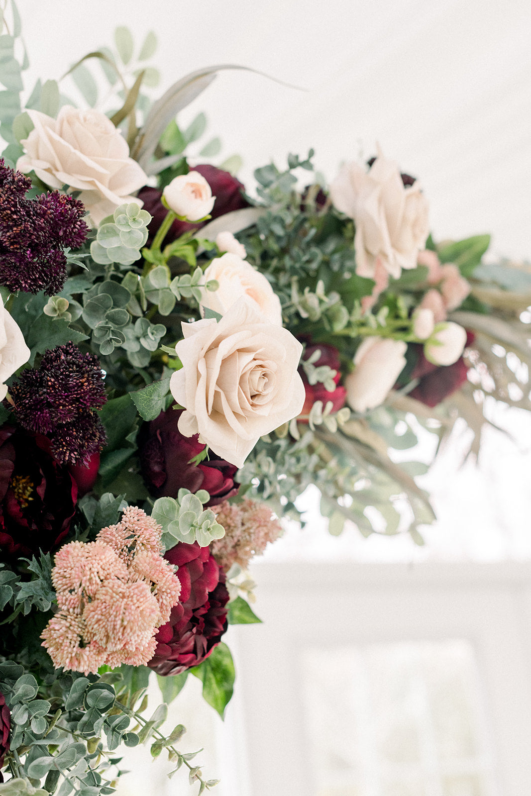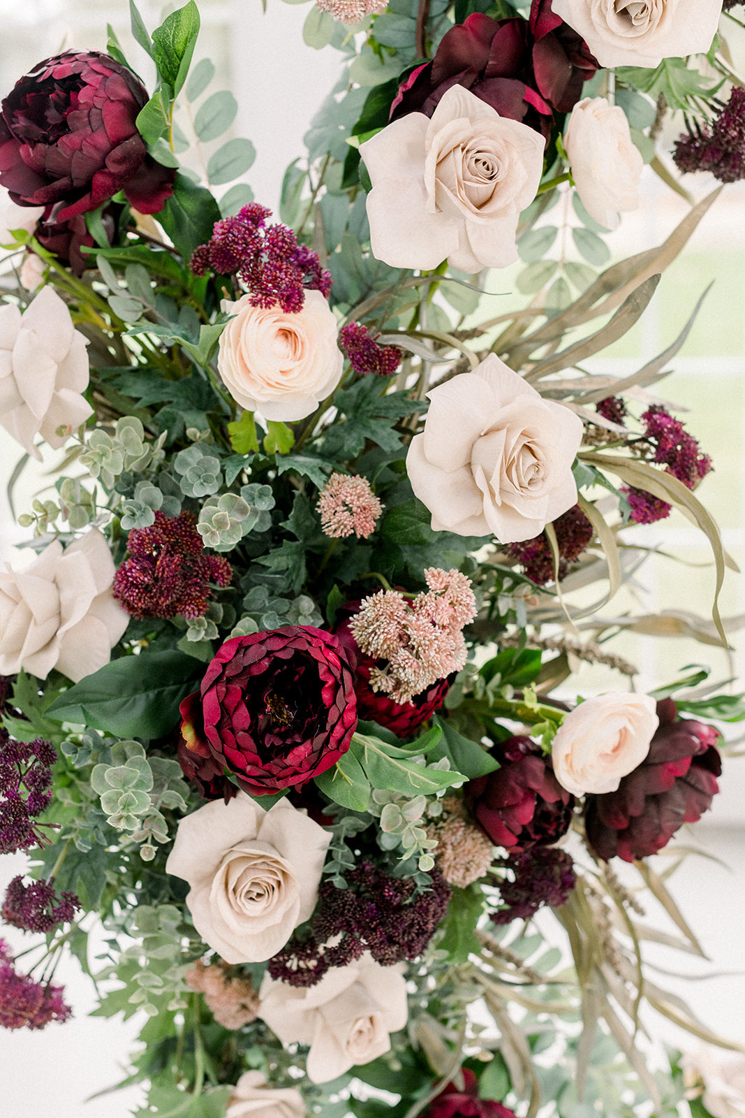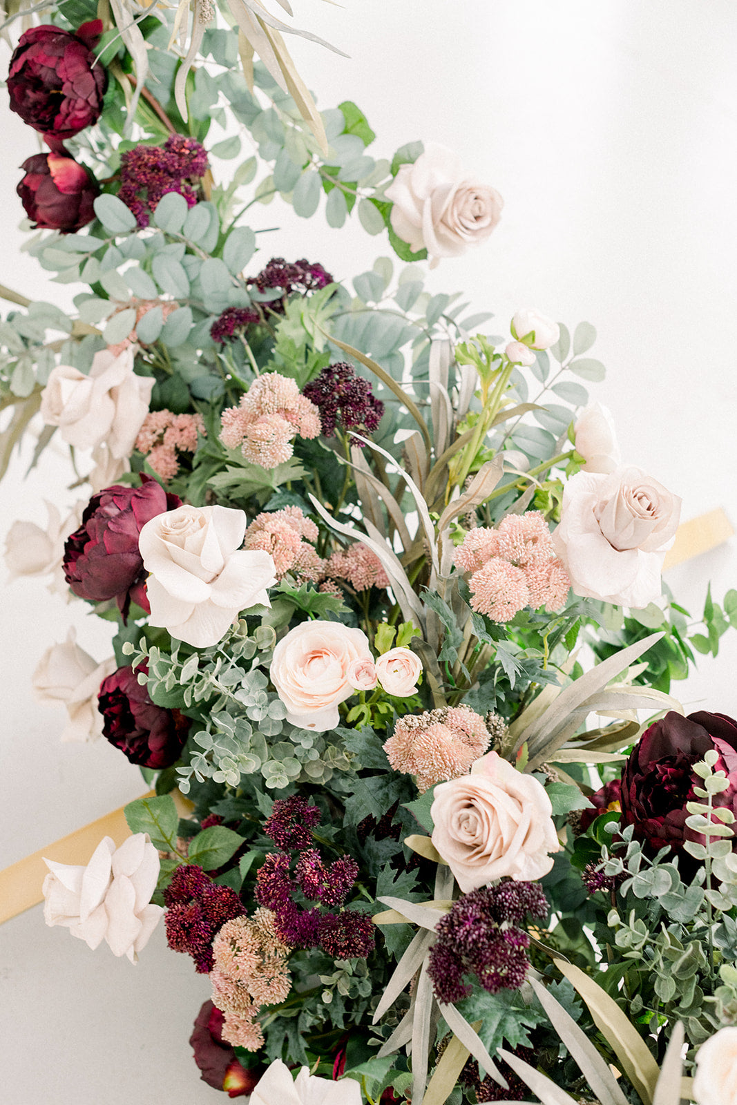Our Evelyn arch is simply breathtaking! It feels both romantic and airy adorned in hundreds of the most beautiful merlot peonies, blush sedum, & mauve roses.