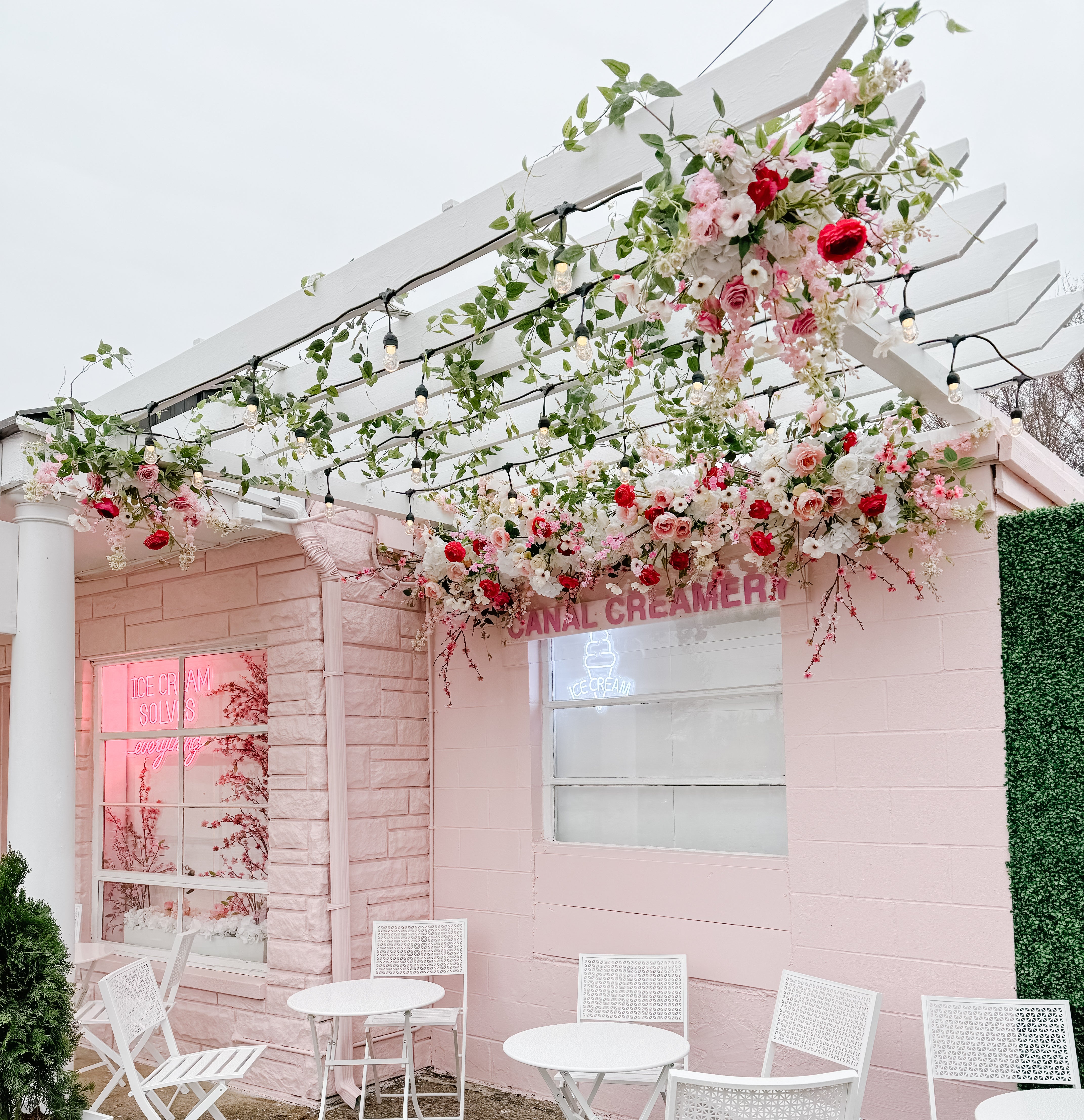 Next, we will demonstrate the art of design with a light and airy natural look on the buildings, using artificial flowers. We will also teach you different mechanics detailing how to properly secure the flowers to the buildings, ceilings, and walls to be removable or semi permanent.